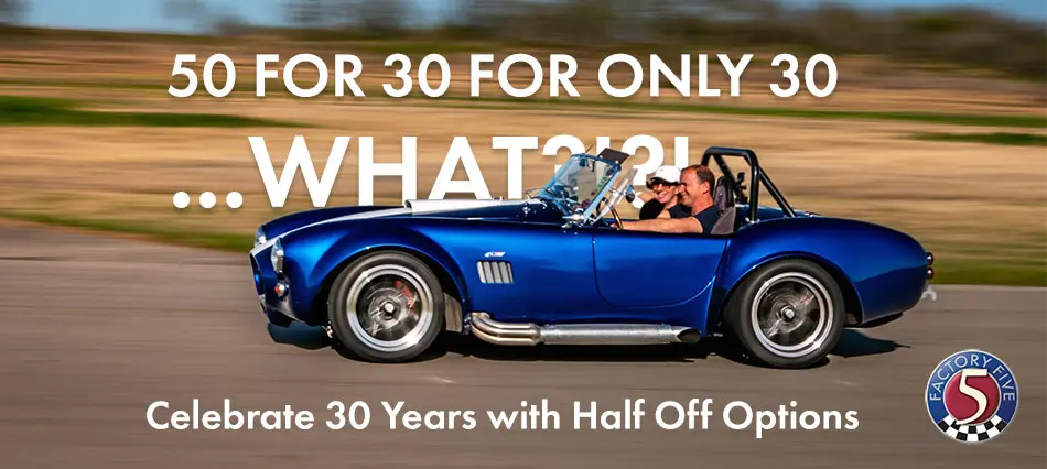 Take 50% off parts, options, and upgrades on nearly any Factory Five kit.This sale does not apply to the Mk5 Roadster, however, the first 10 Mk5 orders will receive a free leather seat upgrade!