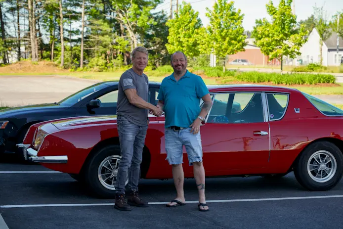 Customer Andre S. shows FFR Tech team members Travis and Dave V. his Mk4 Roadster.