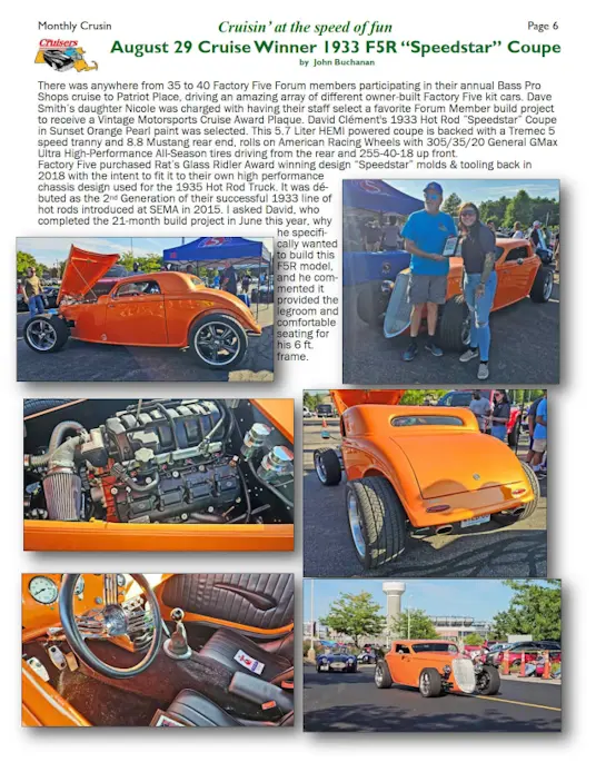 David’s Factory Five Speedstar has already earned a name for itself, winning first place at its first car show and getting looks wherever he goes. His most recent award was a Vintage Motorsports Cruise Award plaque at the annual Factory Five Night put on by Mass Cruisers at Patriot Place.