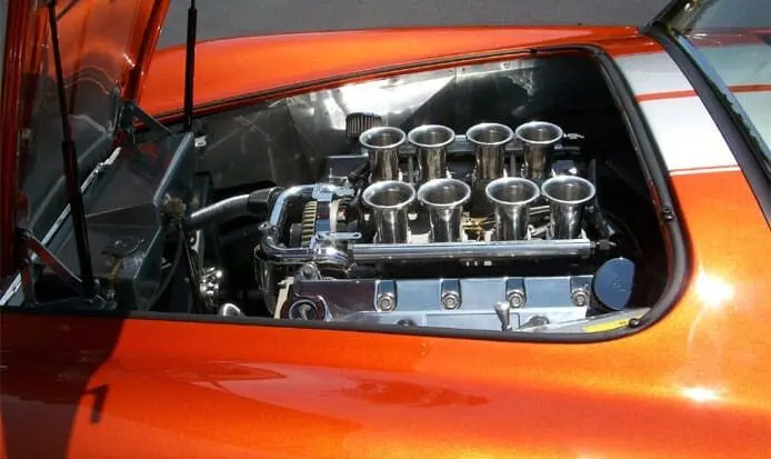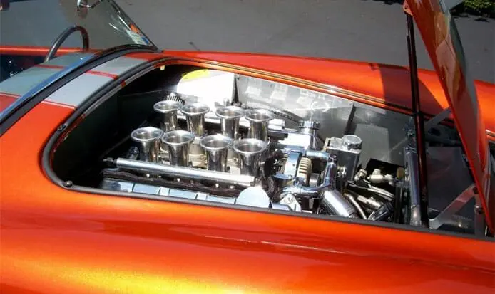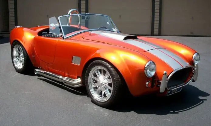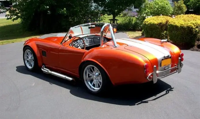 Over on www.thefactoryfiveforum.com, Factory Five customer Don P. has announced the graduation of his Mk3 Roadster. The Victory Nuclear Sunset Tangerine and Mercedes Silver Roadster is powered by a brand new 2004 Mach 1 4.6L DOHC with stacked fuel injection from Very Cool Parts, a Tremec T-45 transmission and 4-link 8.8 rear end.