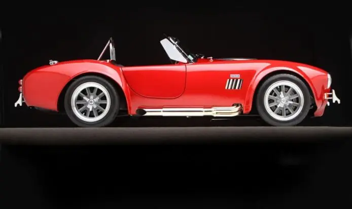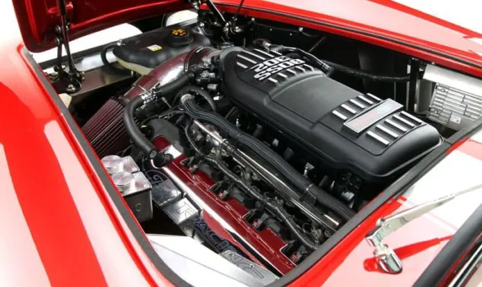 The car is powered by Ford’s new 5.0L Coyote matted to a TKO 5-speed transmission with a 3-link performance rear suspension and KONI coil-overs all around. The car runs stock Factory Five 17″ Halibrand style wheels and optional Wilwood brakes.