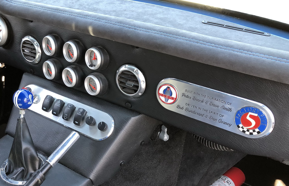 Factory Five Racing rectangular badges are affixed to the bodywork sides and a Factory Five round badge is affixed to the rear cove. Yes, a Shelby Cobra round badge is affixed immediately above the FFR badge, but I read them as “Cobra by Factory Five” I know by court order FFR can’t do that, but owner customers can.