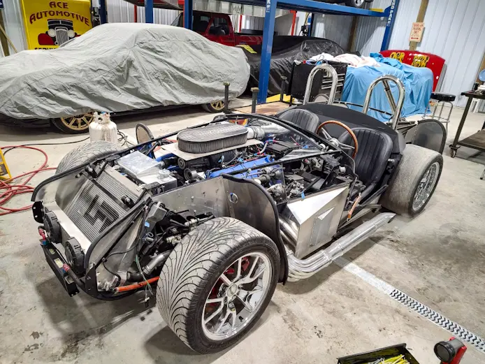 Sean’s build started in 2006 when he received a donor car kit. He sourced a wrecked 2004 Mustang Cobra for the 4.6L DOHC (Terminator) drivetrain and IRS rear end. Custom axles, Cobra brakes, and antilock systems were incorporated, along with a custom alternator mount to relocate the alternator and avoid extra U-joints.