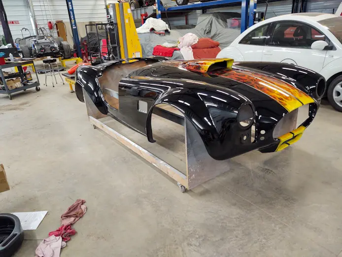 For the paint, Sean wanted to incorporate his signature flames while maintaining the iconic look of the car. After careful thought, he chose black with a ghost stripe that fades over the rear. The work was done by The Toy Shed LLC. and looks incredible!