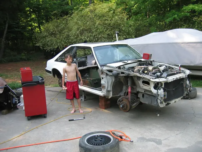 “Age 11 here. My brother Stuart at 13. A 1989 Foxbody becomes an AC Cobra.