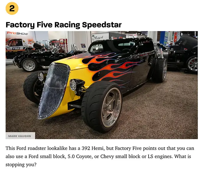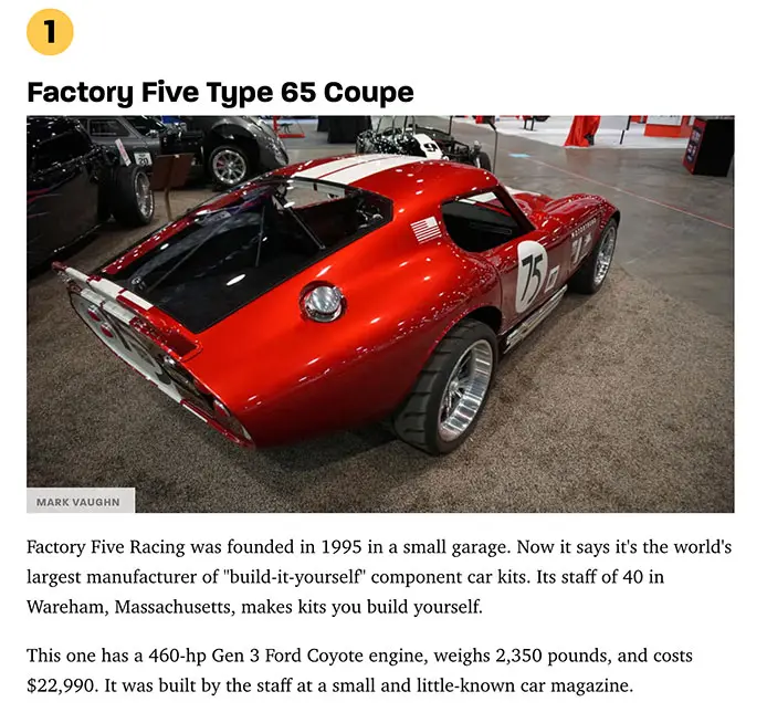 The 2024 SEMA Show is in full swing, and a couple of Factory Five cars have been named favorite cars of the event by Autoweek! The Factory Five Type 65 Coupe built with the team from MotorTrend as part of their 75th Anniversary is first up, and the HEMI-powered Speedstar was right behind it.