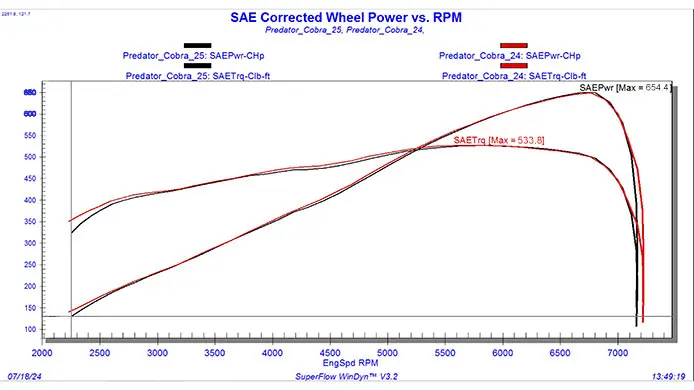 The results were 654.4 HP and 533.8 trq which is right about where it should be for the stock Predator engine. And remember, this is in a car that weighs right around 2,400 lbs.